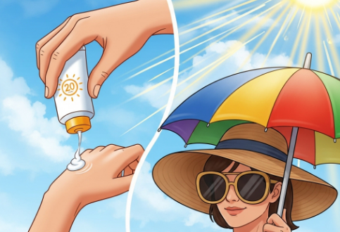 • ๋ฌผ๋ฆฌ์  ์ฐจ๋‹จ: ๋ชจ์ž, ์–‘์‚ฐ, ์„ ๊ธ€๋ผ์Šค ๋“ฑ์„ ์‚ฌ์šฉํ•ด ์ง์ ‘์ ์œผ๋กœ ํ–‡๋น›์„ ๊ฐ€๋ ค์ฃผ์„ธ์š”.