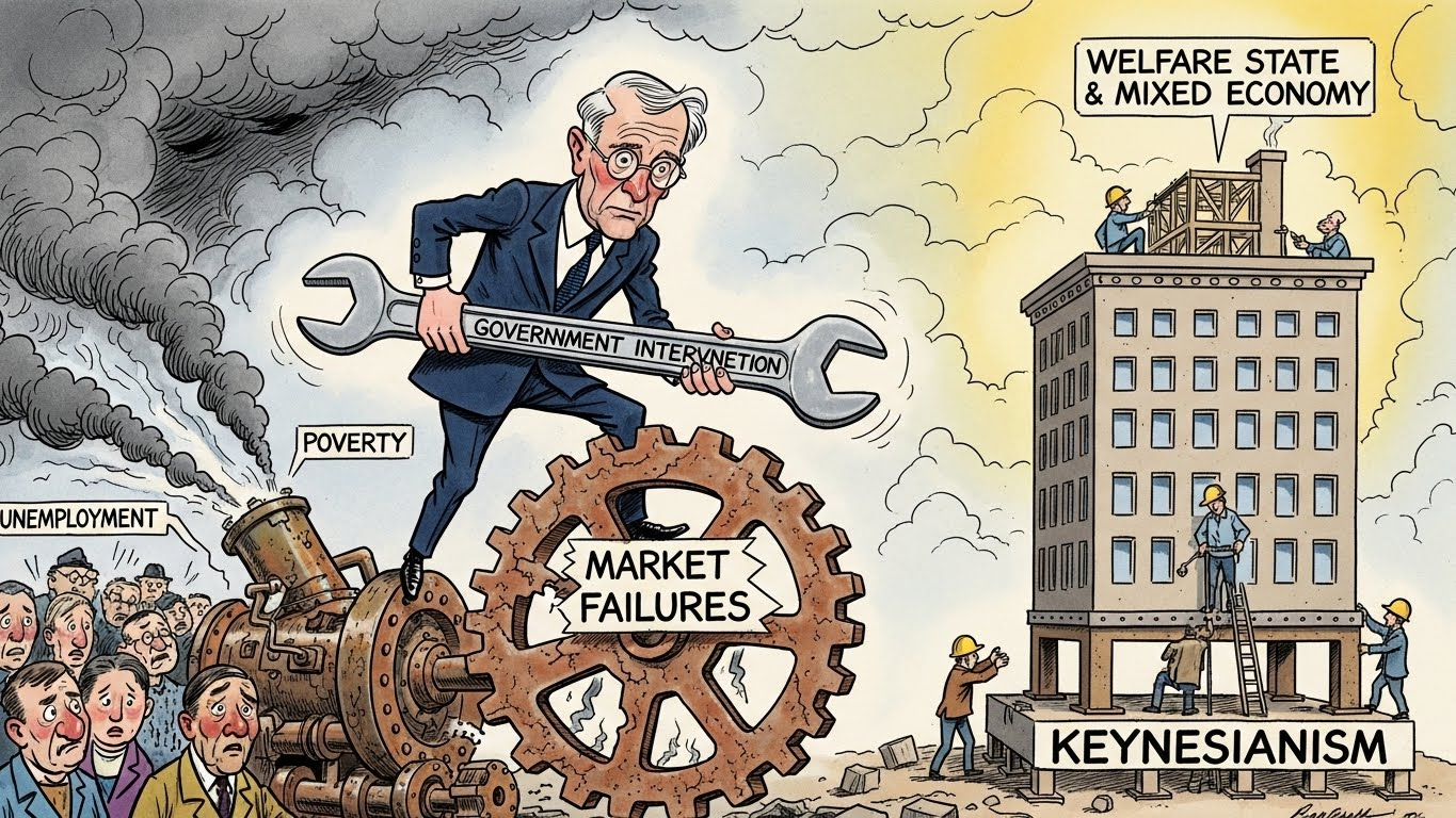 • ์ •๋ถ€ ๊ฐœ์ž…์˜ ์ •๋‹นํ™”: ์ผ€์ธ์Šค์ฃผ์˜์˜ ๋“ฑ์žฅ์œผ๋กœ, ์ •๋ถ€๋Š” ์‹œ์žฅ์˜ ์‹คํŒจ๋ฅผ ๋ง‰๊ธฐ ์œ„ํ•ด ์ ๊ทน์ ์œผ๋กœ ๊ฐœ์ž…ํ•ด์•ผ ํ•œ๋‹ค๋Š” ์ธ์‹์ด ์ž๋ฆฌ ์žก์•˜์Šต๋‹ˆ๋‹ค. ์ด๋Š” ์ „ํ›„ ๋ณต์ง€ ๊ตญ๊ฐ€์™€ ํ˜ผํ•ฉ ๊ฒฝ์ œ ์ฒด์ œ์˜ ๊ธฐ์ดˆ๊ฐ€ ๋˜์—ˆ์Šต๋‹ˆ๋‹ค.