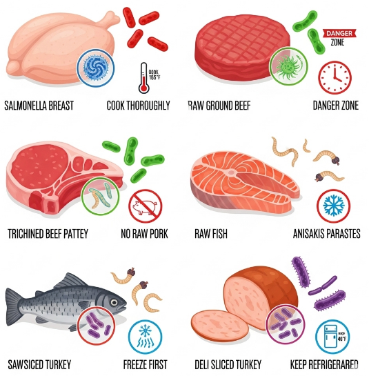 - ๋ผ์ง๊ณ ๊ธฐ: ๊ทผ์ก ๊น์ํ ๊ณณ๊น์ง ์นจํฌํ ์ ์๋ ์ ๊ตฌ์กฐ์ถฉ ๋ฑ ์น๋ช ์ ์ธ ๊ธฐ์์ถฉ ์ํ์ด ์์ด ์๊น์ง ์์ ํ ์ตํ์ผ ์์ .