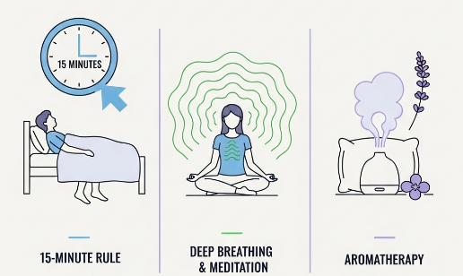 • ์•„๋กœ๋งˆ ์˜ค์ผ ํ™œ์šฉ: ๋ผ๋ฒค๋”, ์บ๋ชจ๋งˆ์ผ ๋“ฑ ์•„๋กœ๋งˆ ์˜ค์ผ์€ ์‹ฌ์‹ ์„ ์•ˆ์ •์‹œํ‚ค๋Š” ๋ฐ ๋„์›€์„ ์ค๋‹ˆ๋‹ค. ์ž ๋“ค๊ธฐ ์ „ ๋ฒ ๊ฐœ์— ํ•œ๋‘ ๋ฐฉ์šธ ๋–จ์–ด๋œจ๋ฆฌ๊ฑฐ๋‚˜ ๋””ํ“จ์ €๋ฅผ ์‚ฌ์šฉํ•˜๋Š” ๊ฒƒ๋„ ์ข‹์€ ๋ฐฉ๋ฒ•์ด์—์š”.