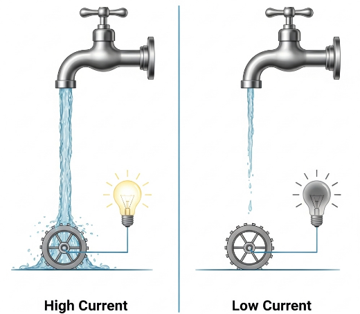 • ๋งŽ์€ ๋ฌผ์˜ ์–‘: ์ˆ˜๋„๊ผญ์ง€๋ฅผ ํ™œ์ง ์—ด๋ฉด ๋ฌผ์ด ์ฝธ์ฝธ ์Ÿ์•„์ง€์ฃ ? ๋†’์€ ์ „๋ฅ˜๋Š” ๊ทธ๋งŒํผ ๋งŽ์€ ์–‘์˜ ์ „์ž๊ฐ€ ํ๋ฅธ๋‹ค๋Š” ๋œป์ด์—์š”.