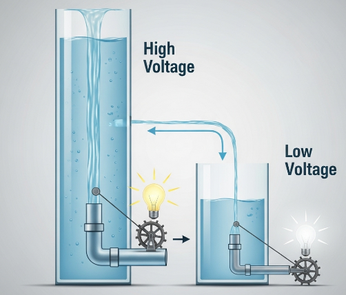 • ๋†’์€ ๋ฌผํ†ต: ๋ฌผํ†ต์ด ๋†’์„์ˆ˜๋ก ๋ฌผ์ด ์•„๋ž˜๋กœ ๋–จ์–ด์ง€๋Š” ํž˜์ด ๊ฐ•ํ•ด์ง€๊ฒ ์ฃ ? ๋†’์€ ์ „์••์€ ๊ทธ๋งŒํผ ์ „๊ธฐ๋ฅผ ๊ฐ•ํ•˜๊ฒŒ ๋ฐ€์–ด์ฃผ๋Š” ํž˜์ด ์„ธ๋‹ค๋Š” ๋œป์ด์—์š”.
