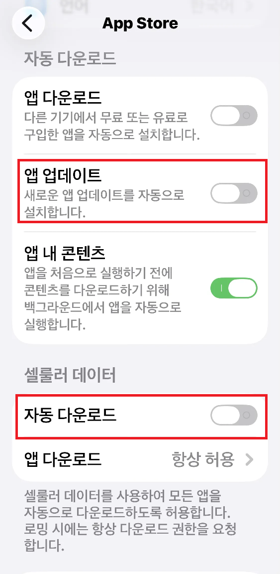 - '์๋ ๋ค์ด๋ก๋' ์น์ ์์ '์ฑ ์ ๋ฐ์ดํธ'๋ฅผ ๋นํ์ฑํ(Off)ํ๋ฉด ๋ฉ๋๋ค.