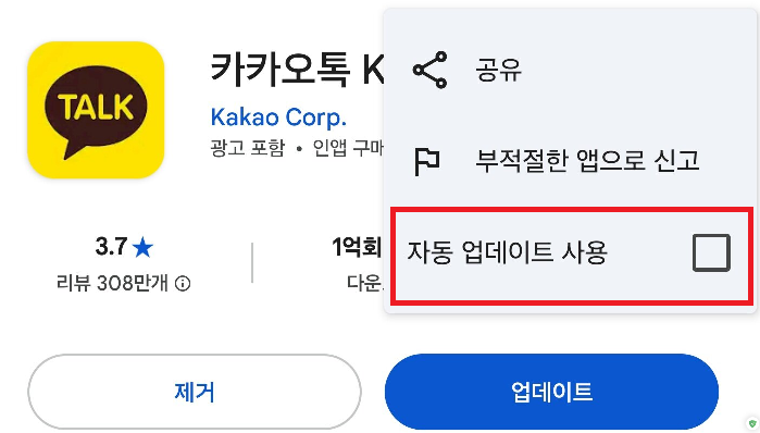 "์ฑ ์๋ ์ ๋ฐ์ดํธ ์ํจ"์ ์ ํํ๋ฉด ๋ชจ๋ ์ฑ์ ์๋ ์ ๋ฐ์ดํธ๊ฐ ๊บผ์ง๋, ์นด์นด์คํก๋ง ๋๊ณ ์ถ๋ค๋ฉด ์๋ ๋ฐฉ๋ฒ์ ํ์ฉํ์ธ์.