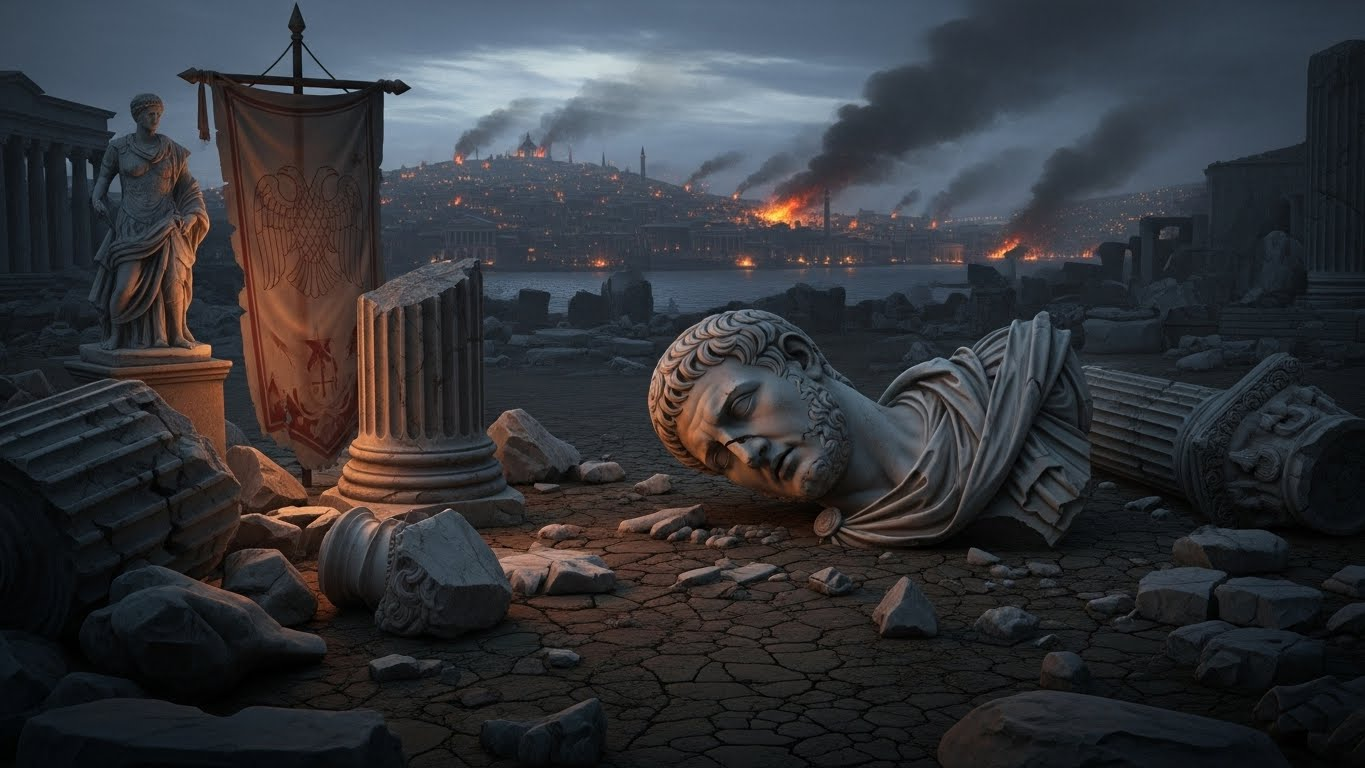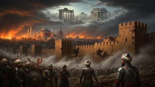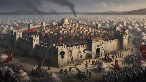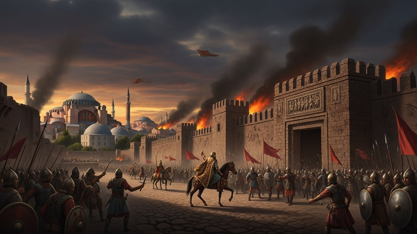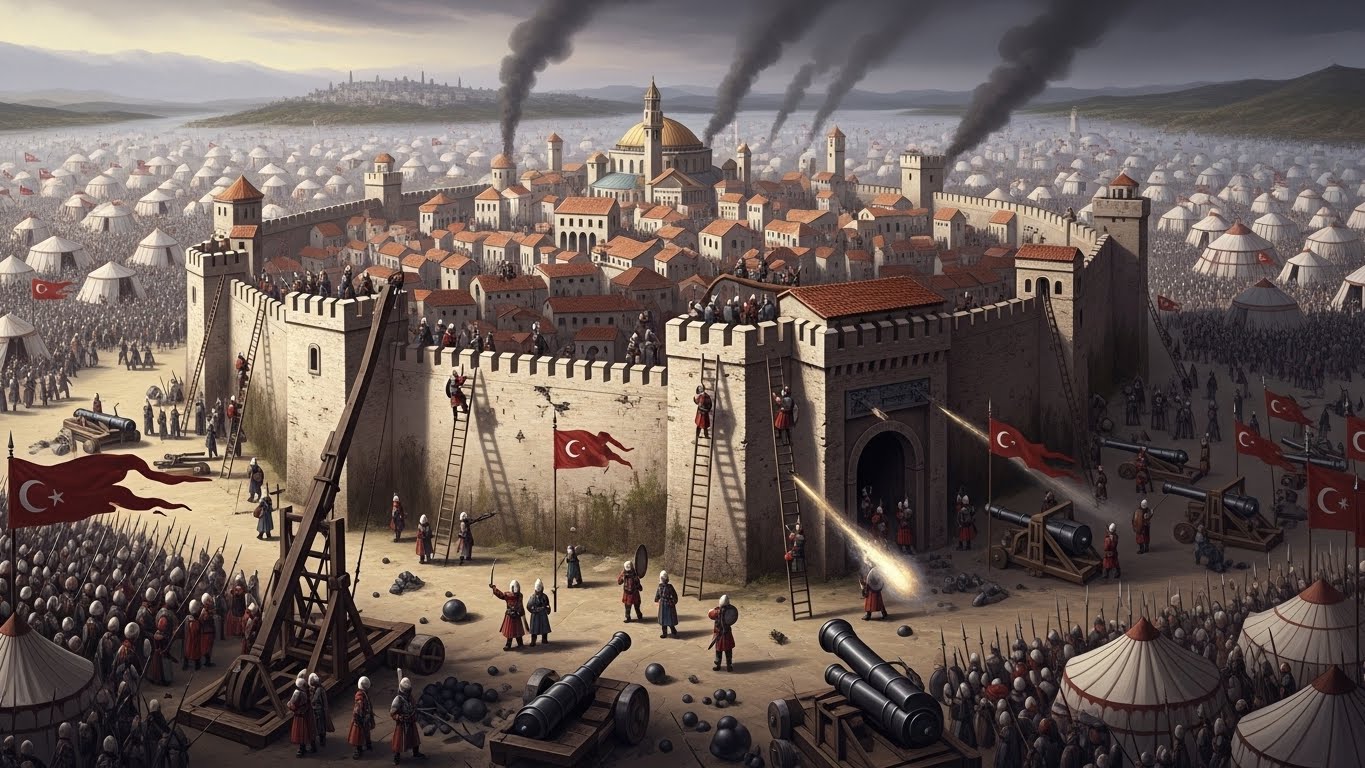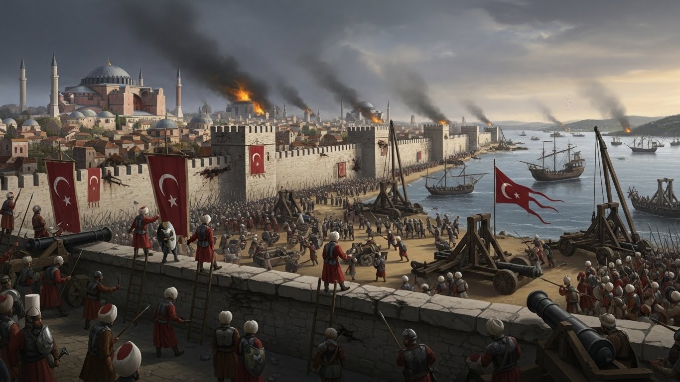 - ์ตํ: 1453๋ 5์ 29์ผ, ์ค์ค๋ง๊ตฐ์ด ์ต์ข ๋ํ์ ์ฑ๊ณตํ๋ฉฐ ๋์๋ฅผ ํจ๋ฝ์์ผฐ์ต๋๋ค. ๋น์ํฐ์ ์ ๊ตญ์ ๋ง์ง๋ง ํฉ์ ์ฝ์คํํฐ๋ ธ์ค 11์ธ๋ ์ฑ๋ฒฝ ์์์ ์ฅ๋ ฌํ๊ฒ ์ ์ฌํ๋ฉฐ ์ฒ๋ ์ ๊ตญ์ ๋ง์ ๋ด๋ ธ์ต๋๋ค.