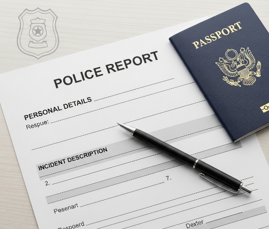 ๊ฒฝ์ฐฐ์๊ฒ ์ฌ๊ถ์ ์์ด๋ฒ๋ ธ๋ค๊ณ ๋งํ๊ณ , '๋ถ์ค ์ฆ๋ช ์(Police Report)'๋ฅผ ๋ฐ๊ธ๋ฐ์์ผ ํฉ๋๋ค. ์ด ์๋ฅ๋ ๋์ฌ๊ด ๋๋ ์์ฌ๊ด์ ์ ์ถํด์ผ ํ๋ฏ๋ก ๋ฐ๋์ ๋ฐ์์ผ ํด์.