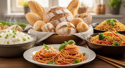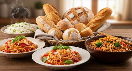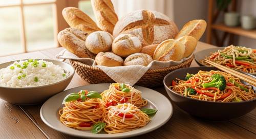 • ๊ณก๋ฌผ๋ฅ˜: ์Œ€๋ฐฅ, ๋นต, ๊ตญ์ˆ˜, ํŒŒ์Šคํƒ€ ๋“ฑ ์ •์ œ๋œ ๊ณก๋ฌผ (๋‹จ, ํ†ต๊ณก๋ฌผ์€ ํ“จ๋ฆฐ ํ•จ๋Ÿ‰์ด ์•ฝ๊ฐ„ ๋” ๋†’์œผ๋‹ˆ ์ฃผ์˜)