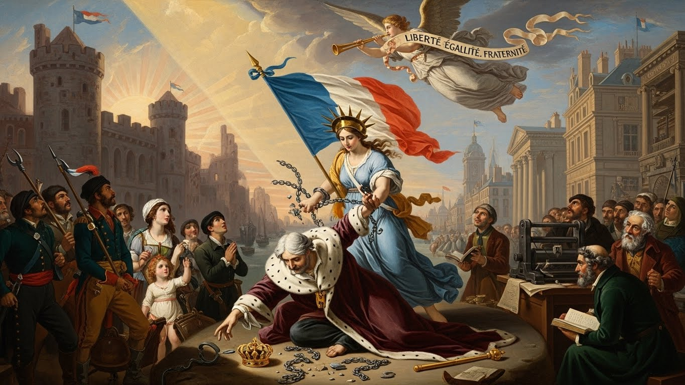 ํ๋์ค ํ๋ช ์ ์ธ๋ฅ์๊ฒ ์์ , ํ๋ฑ, ๋ฐ์ ๋ผ๋ ๋ณดํธ์ ๊ฐ์น๋ฅผ ์ ์ฌํ๊ณ , ๊ตญ๋ฏผ ์ฃผ๊ถ๊ณผ ๊ทผ๋ ๊ตญ๋ฏผ ๊ตญ๊ฐ์ ์๋๋ฅผ ์ด์ด ์ธ๊ณ์ฌ์ ํ๋ฆ์ ์์ ํ ๋ฐ๊พธ์ด ๋์์ต๋๋ค.